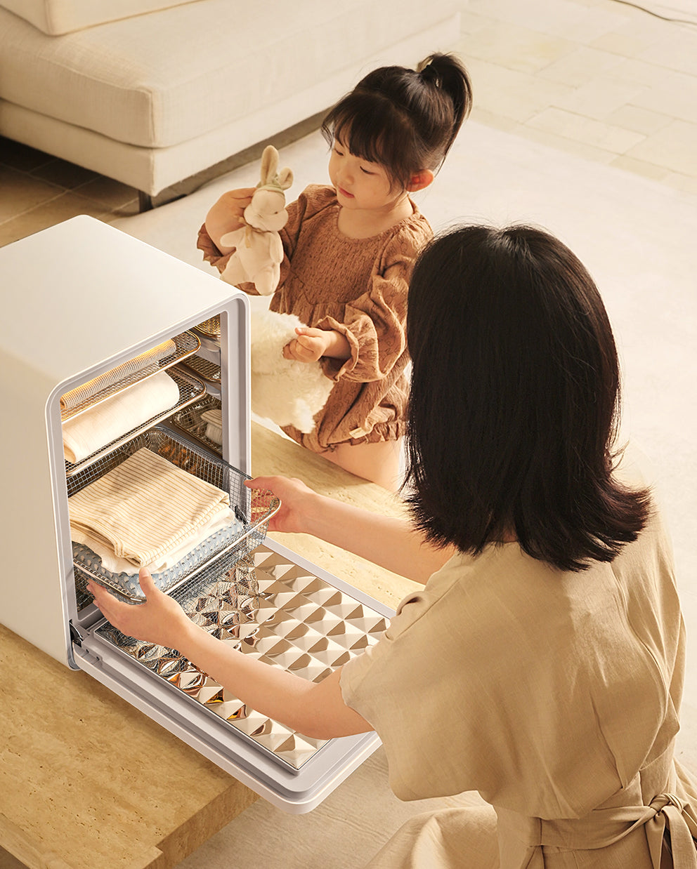A micro-porous carbon filter removes bacteria and odors, while patented Fresh Bake™ Quick Dry Technology keeps bottles, toys, and clothes fresh. The foldable viewing window lets you monitor the process anytime for peace of mind.