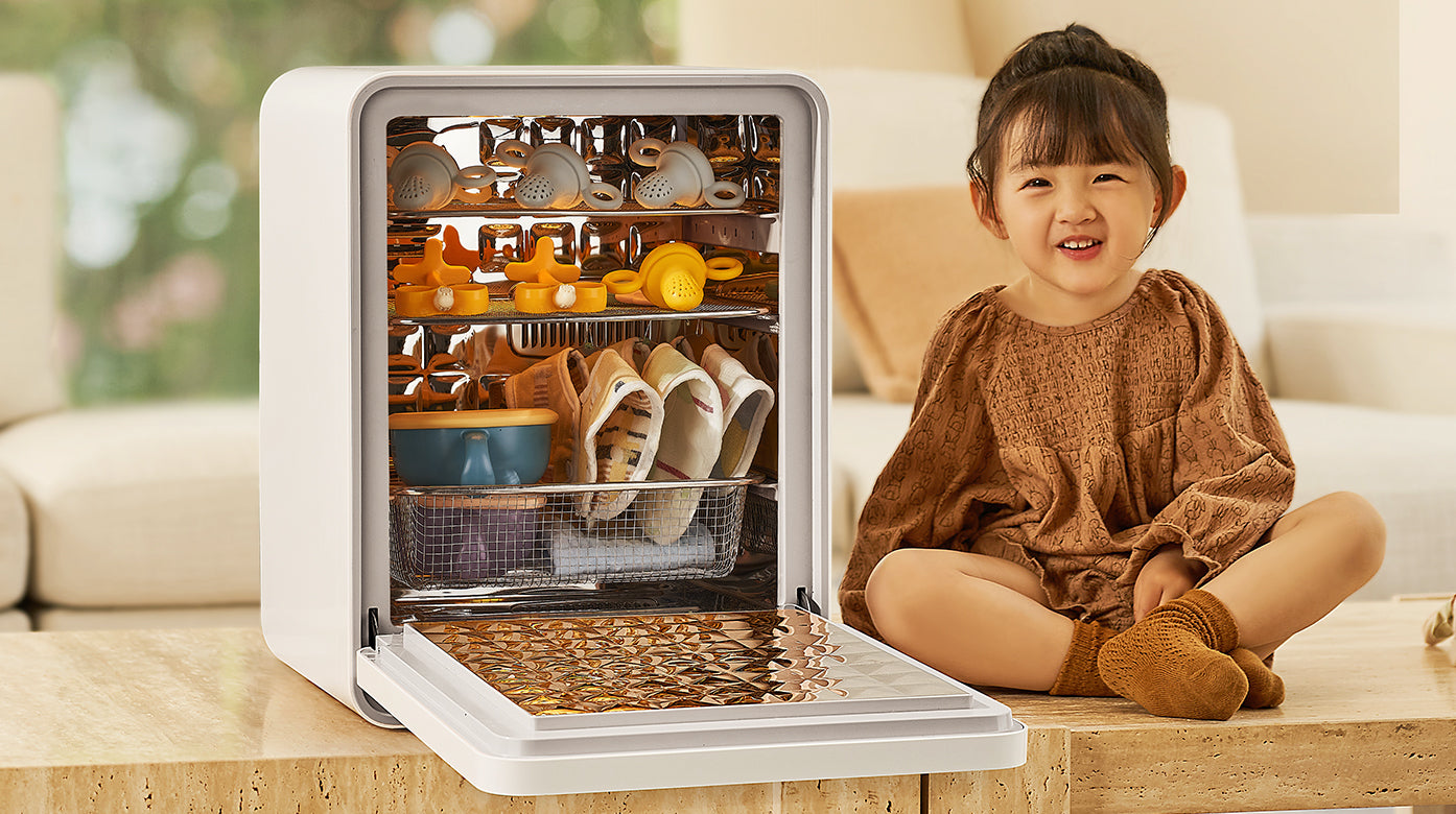 A micro-porous carbon filter removes bacteria and odors, while patented Fresh Bake™ Quick Dry Technology keeps bottles, toys, and clothes fresh. The foldable viewing window lets you monitor the process anytime for peace of mind.